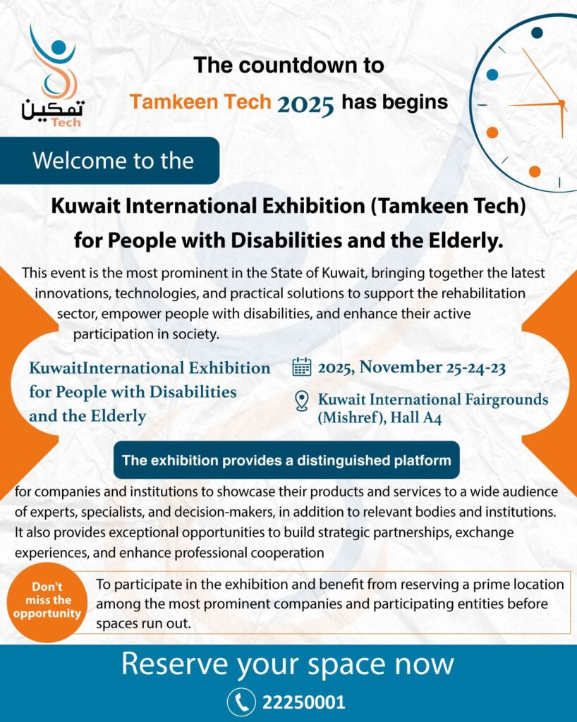 Tamkeen Tech Exhibition is the first international event in Kuwait focused on showcasing innovative technological solutions for empowering people with disabilities and the elderly. The exhibition integrates technology to improve daily life and presents the latest devices and smart initiatives.